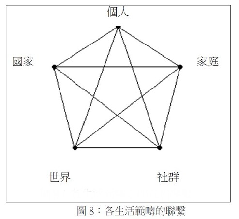 比較之下,當可發現,文字中「家庭」和「社群」分列,但圖中卻把「家庭」納入「社群」之下,誠然,家庭可以作為社群的一種來理解,但這又和《諮詢稿》全文把「家庭」和「社群」分為兩個範疇不同。筆者估計,這裡的錯誤是因為想以「文氏圖」(Venn Diagram)的形式表述,結果便硬把「家庭」楔進「社群」之內,卻造成了和文字表述矛盾的錯誤,這是典型的形式蓋過內容的錯誤,是在學生學習圖形思考時常有的,只是想不到教育局課程發展人員也會犯上吧。