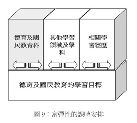 這個圖想說明的是「富彈性的課時安排」,以獨立的方塊來表示彈性的課時,已經夠有趣的,而按此圖示,似乎是「德育及國民教育科」「其他學習領域及學科」、「相關學習經歷」三者之間的課時「競爭」,例如中間的一塊膨脹的話,則勢必向左右擠壓,一是左右兩塊縮窄,一是給迫至離開下面的承托(「德育及國民教育的學習目標)。這樣的圖示,卻和其文字表述矛盾,其文字說明,其他學科可以「蘊涵」德育及國民教育,其他學習經歷也可作培育「積極主動、富責任感的社會公民、國家國民及世界公民」(頁55),於此,圖和文這樣矛盾,當中顯然有錯。