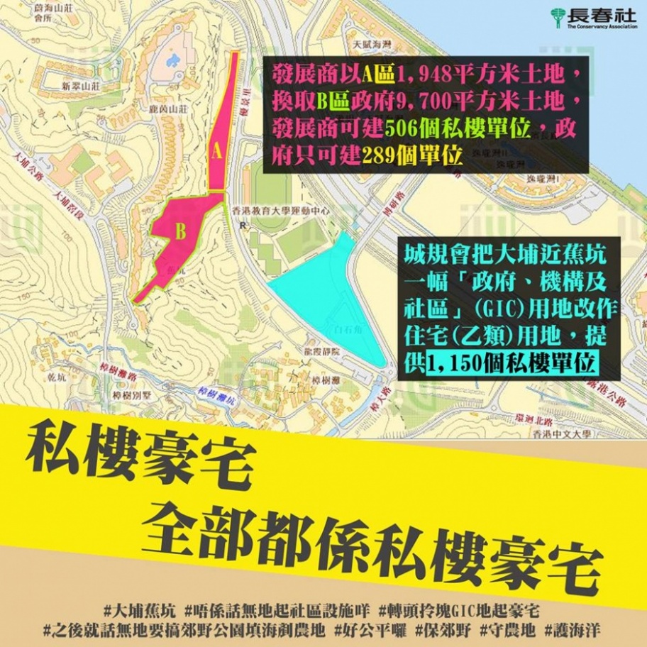 當政府不斷指「住劏房好慘」、「唔夠地起老人院」,所以要發展郊野公園邊陲時解決問題,政府卻帶頭把「政府、機構或社區」用地改為建私樓。今年5月,城規會把位於大埔近蕉坑一幅「政府、機構或社區」用地,改劃作住宅(乙類)9,最大總樓面面積88,200平方米,當中不超過7,500平方米須用作零售用途,最高建築物高度限為主水平基準上50米,預計可提供1,150個私樓單位(沒錯,是私樓單位!)。