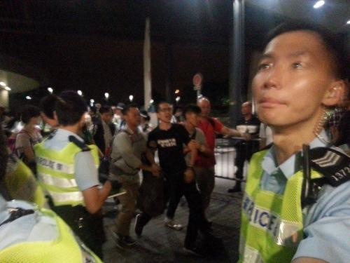 圖:2014年6月13日,反新界東北示威者衝擊立法會,失敗後在立法會示威區靜坐,遭警方清場,周諾恆是被捕者之一,在警車上被毆打