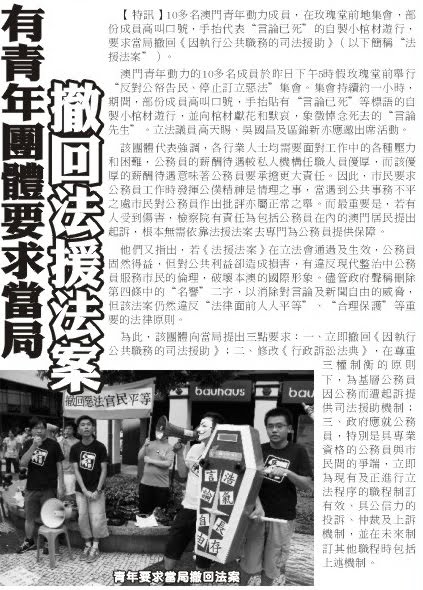 澳門青年動力昨日下午在中區玫瑰堂前地舉行「撤回惡法,官民平等」的示威集會,要求特區政府立即撤回《因執行公共職務的司法援助》。他們抬出既似盾牌又像棺木的道具「言論先生」,並讓與會者獻上黃色菊花,以寓意若惡法不撤,澳門言論自由會死亡之意。包括參加集會的青年人和網民以及市民分別簽名和寫留言來表達反對「公職法援」法案。有市民更批評,該法案的「官告民」條文對市民極不公平,且更是令澳門倒退,立法會絕不可讓其通過。