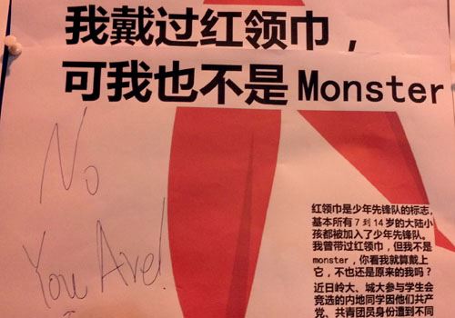 今天有一位內地同學在學校的民主牆上貼了一張海報,大意是說「我雖然戴過紅領巾,但我不是monster」,您在下面用大字回覆了一句,「No, You Are!」。