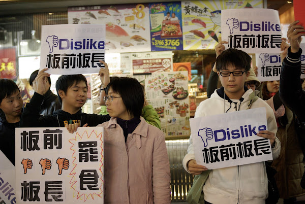 昨天的抗議行動由下午六時半開始,持續了一小時,約有三十位市民參與。環保觸覺批評和之味集團為了迎合消費者口味,不理會環保團體反對,日前投得「日本一」藍鰭,是毫無社會責任。另外,到場聲援的社會主義行動亦批評大財團罔顧海洋生態,掠奪公共資源圖利。