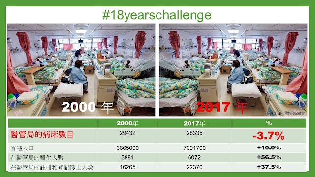 翻查政府財政預算案, 2000年醫管局醫院的病床數目是29432張,而到了2017年,病床數目竟然是28335張!在這18年,香港人口增長了11% ,即73萬,而病床數目反而減少了1097張。