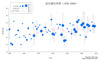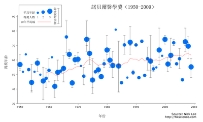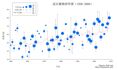 至今總共十位華人曾經獲獎,其中六位獲得物理學獎,二位獲得化學獎,達賴喇嘛得和平獎,高行健得文學獎。可見我們比較擅長理科,因此本文也會集中探討理科,圖一至圖三分別顯示了物理學、化學和醫學獎每屆的得獎概況,圓點所在為當年的平均得獎年齡,其大小代表當年的得獎人數。(注意,我用的是「得獎年齡」,而非「等了多久」。對於高錕這個「遲來」的諾獎,或者探討「等了多久」更有意思,這也是我的原意,但是後來發覺,得獎者作出某項「貢獻」的年份,往往是難以客觀斷定的。高錕的情況尚算容易,因為他的成就十分特定和明確。好些諾獎是表揚某某科學家的多年貢獻,類似「終身成就獎」,實在很難說他們從哪時開始「等」,「等了多久」也就無從說起。退而求其次,「得獎年齡」大概是「等了多久」的反映,愈老大概表示等得愈久,個別情況不能作準,但是六十年的資料裡頭,希望看出一些端倪吧。)