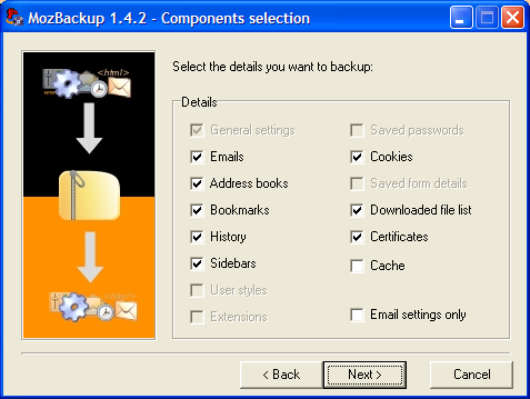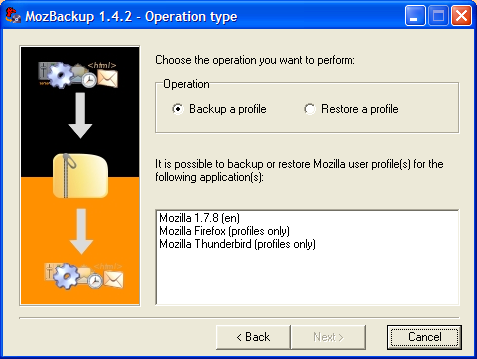 MozBackup的原作者 Pavel Cvrcek來自捷克,是一個備份和還原Mozilla Firefox、Mozilla Thunderbird、Mozilla Sunbird、Flock、Mozilla Suite、 Seamonkey、 Spicebird、 Netscape、 Songbird、 Wyzo、 Postbox 等軟體個人設定檔的程式。