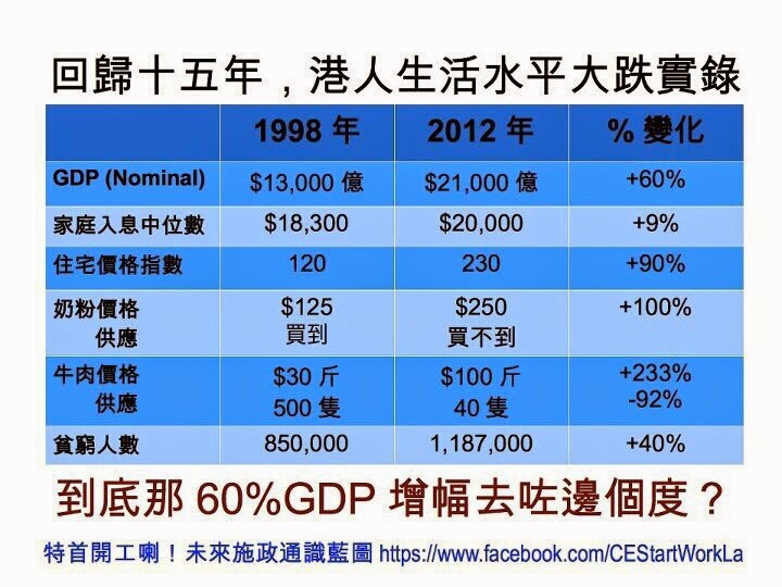 中央和梁振英仍相信以前香港賴以成功的方程式。就是商家賺大錢的話,他們會把經濟利益滴漏給普羅大眾,並改善他們的生活。因此如果政府和商家互相支持,社會就會穩定。