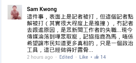 以下係一個關於打記者嘅報道,細看一下讀者回覆,一個支持打記者嘅 post 竟然可以有十幾人 like,實在好恐怖,